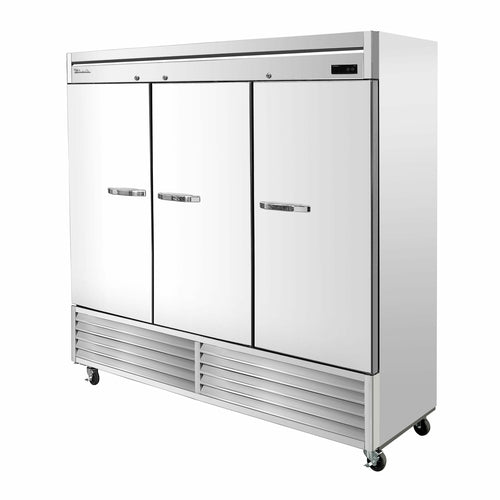 Freezer, reach-in, three-section, 72 cu. ft, capacity, bottom-mount self-contained refrigeration, (3) full-size solid self-closing doors (locking), metal door handles, door open alarm, (12) adjustable wire shelves, digital controls, LED interior lighting, stainless steel interior & exterior, 4" swivel casters (2 braked), R290 Hydrocarbon refrigerant, 1 HP, 115v/60/1-ph, 9.9 amps, cord with NEMA 5-15P, cETLus, ETL-Sanitation, ENERGY STAR®