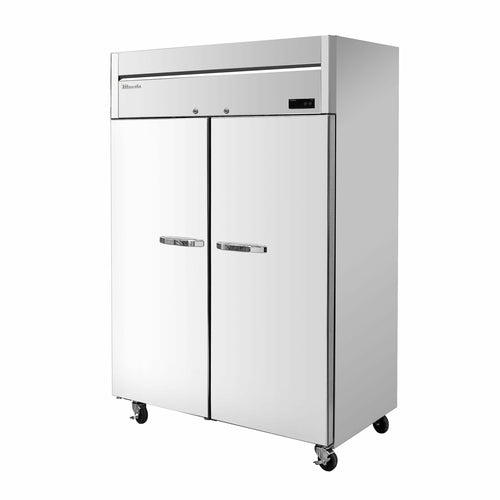 Refrigerator, reach-in, two-section, 49 cu. ft. capacity, top-mounted self-contained refrigeration, (2) full-size self-closing solid doors (locking), metal door handles, door open alarm, (8) adjustable wire shelves, digital controls, LED interior lighting, stainless steel interior & exterior, 4" swivel casters (2 braked), R290 Hydrocarbon refrigerant, 1/4 HP, 115v/60/1-ph, 3.2 amps, cord with NEMA 5-15P, cETLus, ETL-Sanitation, ENERGY STAR®