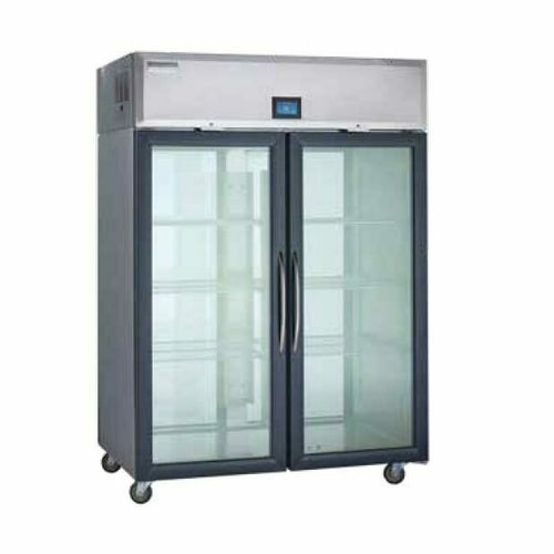 Specification Line® Refrigerator, Pass-Thru, two-section, 50.0 cubic feet capacity, top-mounted self-contained refrigeration system, (4) full-height hinged glass doors (locking), (6) adjustable chrome wire shelves, 4.3" easyTouch® screen temperature display/control with remote monitoring, LED interior lighting, pilaster with shelf clips, stainless steel exterior front, sides & interior, (4) 5" locking casters, GreenGenius™ R290 Hydrocarbon refrigerant, 0.38 HP, 115v/60/1-ph, 6.5 amps, NEMA 5-15P, NSF, cULus, ENERGY STAR®