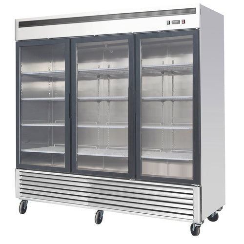 Reach-In Refrigerator, three-section, 81.9" W, 68 cu. ft. capacity, bottom-mounted self-contained refrigeration, (3) glass self-closing locking hinged doors, (9) adjustable shelves, 33° to 38°F temperature range, digital display/controls, stainless steel exterior, stainless steel interior, (6) 4" casters (3 locking), R290a refrigerant, 1/3 HP, 115v/60/1-ph, 4.2 amps, cETLus, ETL-Sanitation