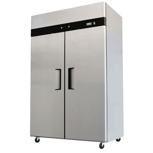 Reach-In Freezer, two-section, 51.7" W, 43.0 cu. ft. capacity, top-mounted self-contained refrigeration, (2) solid self-closing locking hinged doors, (6) adjustable shelves, -10° to 0°F temperature range, digital display/controls, stainless steel exterior, stainless steel interior, (4) 4" casters (2 locking), R290a refrigerant, 3/4 HP, 115v/60/1-ph, 8.6 amps, cETLus, ETL-Sanitation