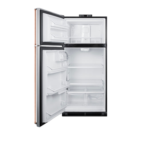 Accucold Break Room Refrigerator-Freezer, 18 cu. ft. capacity, full-length antimicrobial copper pipe style handles, (2) NIST calibrated dial thermostats with digital display, 36° - 46°F refrigerated temperature range, 0° - 10°F freezer temperature range, high/low temperature audible alarms, frost-free operation, interior light, (2) adjustable glass refrigerator shelves, (3) full-door & (1) half-door refrigerator shelves, gallon door storage, (2) transparent crisper drawers with humidity control, (1) wire freezer shelf, (2) full-door freezer shelves, (2) left-hand swing stainless steel doors, textured black cabinet, interior fan, R134a refrigerant, 115v/60/1-ph, 6.0 amps, CSA