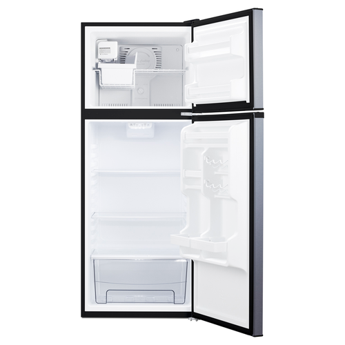 Summit Refrigerator/Top Mount Freezer, 10 cu. ft., 23-1/2"W, factory-installed icemaker, reversible doors, adjustable glass shelves, door storage, gallon door shelf, crisper, frost-free, sealed back, stainless steel look, black cabinet, R600a refrigerant, 115v/60/1-ph, cULus (Household)