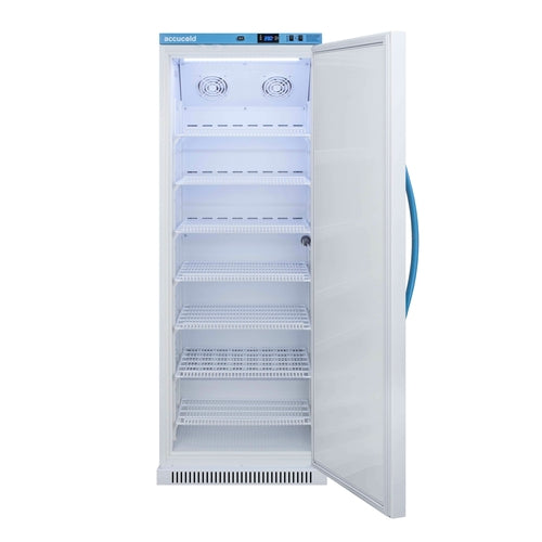 Accucold MOMCUBE™ Breast Milk Refrigerator, one section, 23-3/8"W, 12 cu.ft., 33 to 40ºF preset temperature range, (1) solid hinged door with lock, interior LED lighting, (7) adjustable wire shelves, automatic defrost, digital thermostat, (2) internal fans, temperature, open door & power out alarms, white exterior finish, bottom mount self-contained refrigeration, R600a Hydrocarbon refrigerant, 115V/60 Hz, 1.4 amps, ETL, cETL (Medical)