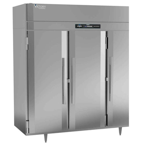 UltraSpec™ Series Refrigerator, Reach-in, three-section, self-contained refrigeration, 68.34 cu. ft. capacity, (3) full height solid hinged doors, (9) silver freeze (chrome-style) shelves, stainless steel exterior, aluminum interior, standard depth cabinet, TOUCH POINT™ electronic temperature control/indicator, LED lighting, expansion valve technology, Santoprene door gaskets with 2 year warranty, stainless steel breakers, R290 Hydrocarbon refrigerant, 3/4 HP, cULus, UL EPH Classified, UL-Sanitation, MADE IN USA
