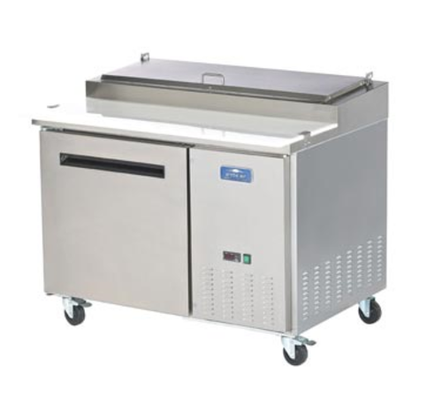Pizza Prep Table, one-section, 47-1/2"W, 12 cu. ft. capacity, self-contained side mounted capillary tube refrigeration, electronic thermostat with digital LED temperature display, 33°F to 41°F temperature range, stainless steel top with raised refrigerated pan rail, 17-3/4"D cutting board, (6) 1/3 size clear lexan pans, (1) vaulted solid hinged self-closing door with 90° stay open feature, (1) shelf, stainless steel front & sides, white ABS interior with stainless steel floor, (4) 3" casters (2 locking), R290 Hydrocarbon refrigerant, 754 BTU/h rejected heated air gain, 1/2 HP, 5.0 amps, cord, NEMA 5-15P, cETLus, ETL-Sanitation