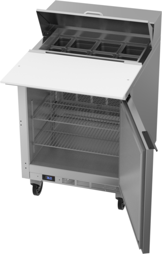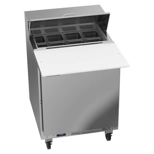 Sandwich Top Refrigerated Counter, one-section, 27"W, 6.76 cu. ft., (1) door, stainless steel top with opening for (6) 1/6 & (2) 1/9 size pans, 17" cutting board, (2) epoxy-coated wire shelves, stainless steel exterior, aluminum interior, rear-mounted self-contained refrigeration, (pans furnished are 4" deep, tops will accommodate 6" deep pans), R290 Hydrocarbon refrigerant, 1/10 HP, cULus, UL EPH Classified, UL-Sanitation, Made in USA