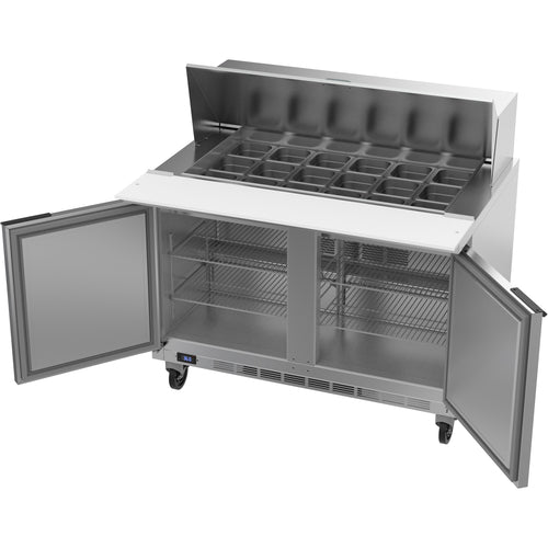 Mega Top Refrigerated Counter, two-section, 48"W, 13.01 cu. ft., (2) doors, stainless steel top with opening for (18) 1/6 size pans, 10" cutting board, (4) shelves, stainless steel exterior, aluminum interior, rear-mounted self-contained refrigeration, (pans furnished are 4" deep, tops will accommodate 6" deep pans) R290 Hydrocarbon refrigerant, 1/6 HP, cULus, UL EPH Classified, UL-Sanitation, Made in USA