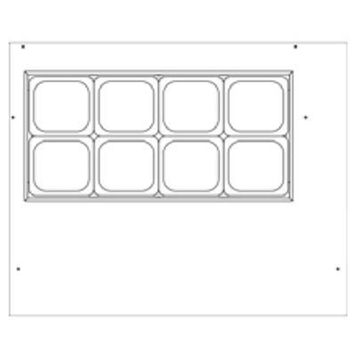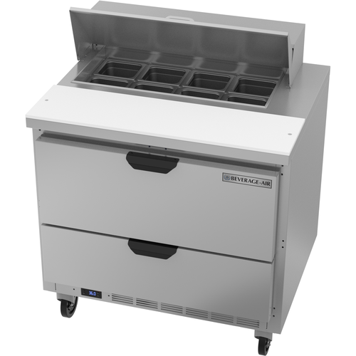 Sandwich Top Refrigerated Counter, one-section, 36"W, 10.01 cu. ft., (2) drawers (upper & lower pull-out drawers accommodate 6" deep pans), stainless steel top with opening for (8) 1/6 size pans (pans furnished are 4" deep, tops will accommodate 6" deep pans), 10" polyethylene cutting board, stainless steel exterior, aluminum interior, rear-mounted self-contained refrigeration, R290 Hydrocarbon refrigerant, 1/6 HP, cULus, UL EPH Classified, UL-Sanitation, Made in USA