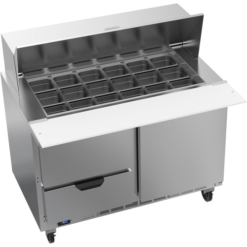 Mega Top Refrigerated Counter, two-section, 48"W, 13.01 cu. ft., (2) drawers (upper & lower pull-out drawers accommodate 6" deep pans), (1) door, (2) shelves, stainless steel top with opening for (18) 1/6 size pans (pans furnished are 4" deep, tops will accommodate 6" deep pans), 10" polyethylene cutting board, stainless steel exterior, aluminum interior, rear-mounted self-contained refrigeration, R290 Hydrocarbon refrigerant, 1/6 HP, cULus, UL EPH Classified, UL-Sanitation, Made in USA