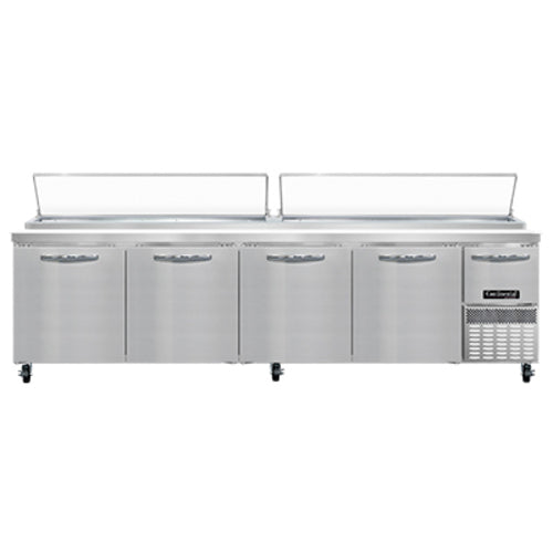 Pizza Prep Table, 118"W, four-section, 44.0 cu ft capacity, forced air, 300 series stainless steel work top with 19" poly cutting board, (4) full & (1) half height field rehingeable doors, electric condensate evaporator, stainless steel front & end panels, aluminum interior, knob-type electronic controller, unit comes standard with expansion valve, side-mounted refrigeration, reversing condenser fan, 3/4 HP, cETLus, NSF