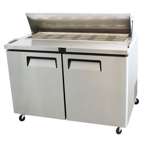 Mega-Top Refrigerated Prep Table, two-section, self-contained, 48.2" W, 14.7 cu. ft. capacity, holds (18) 1/6 pans 4" D (included), (2) solid hinged self-closing doors, (4) shelves, polyethylene cutting board, removable ingredient rail with cover, adapter bars, stainless steel top, front, sides, & interior, rear mounted refrigeration, (4) 4" D casters (2 front locking), R134A refrigerant, 1/3 HP, 115v/60/1-ph, 6.5 amps, cETLus, ETL