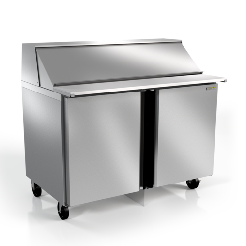 Refrigerated Prep Table, two-section, 48"W, (12) pan capacity top, rear-mounted self-contained refrigeration, (2) hinged solid doors, (4) adjustable epoxy coated shelves, adjustable temperature controls, automatic defrost, automatic condensate evaporator, aluminum interior, stainless steel & galvanized exterior, (4) 5" casters (2 with locks), R290 Hydrocarbon refrigerant, 115v/60/1-ph, 4.1 amps, cord, NEMA 5-15P, cETLus, ETL-Sanitation