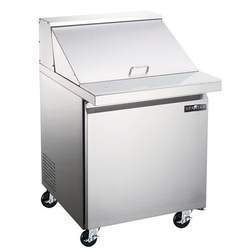 Mega Top Sandwich/Salad Prep Unit, one-section, 5.75 cu. ft., rear mounted self-contained refrigeration, self closing stainless steel door, (1) adjustable plastic coated steel shelf, (9) 1/6 and (3) 1/9 size pan capacity, 3/4" thick cutting board, digital temperature control, 430 stainless steel exterior and 304 stainless steel interior, (4) casters (2 front locking), R290 Hydrocarbon refrigerant, 1/4 HP, 120v/60/1-ph, 5.2 amps, NEMA 5-15P, cETLus, ETL-Sanitation