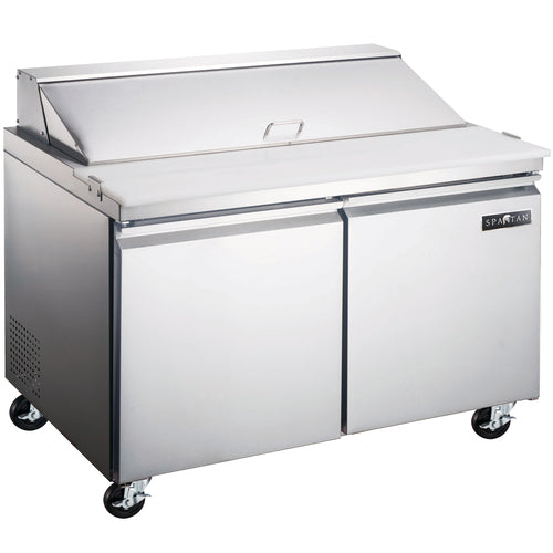 Sandwich/Salad Prep Unit, two-section, 15.0 cu. ft., rear mounted self-contained refrigeration, self closing stainless steel door, (2) adjustable plastic coated steel shelves, (16) 1/6 size pan capacity, 3/4" thick cutting board, digital temperature control, 430 stainless steel exterior and 304 stainless steel interior, (4) casters (2 front locking), R290 Hydrocarbon refrigerant, 1/2 HP, 120v/60/1-ph, 8.3 amps, NEMA 5-15P, cETLus, ETL-Sanitation