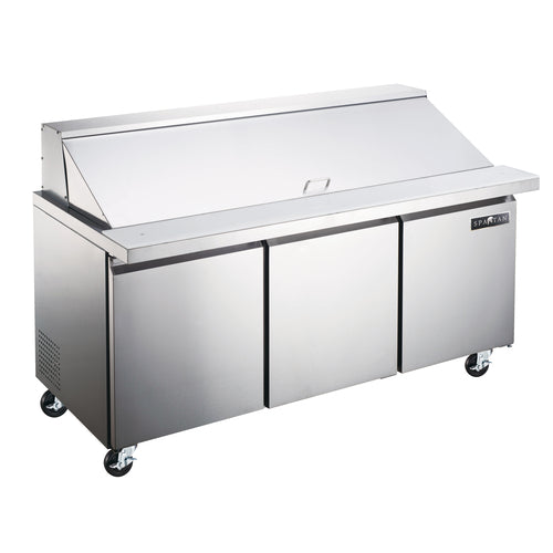 Mega Top Sandwich/Salad Prep Unit, three-section, 18.0 cu. ft., rear mounted self-contained refrigeration, self closing stainless steel door, (3) adjustable plastic coated steel shelves, (30) 1/6 size pan capacity, 3/4" thick cutting board, digital temperature control, 430 stainless steel exterior and 304 stainless steel interior, (4) casters (2 front locking), R290 Hydrocarbon refrigerant, 1/2 HP, 120v/60/1-ph, 9.2 amps, NEMA 5-15P, cETLus, ETL-Sanitation