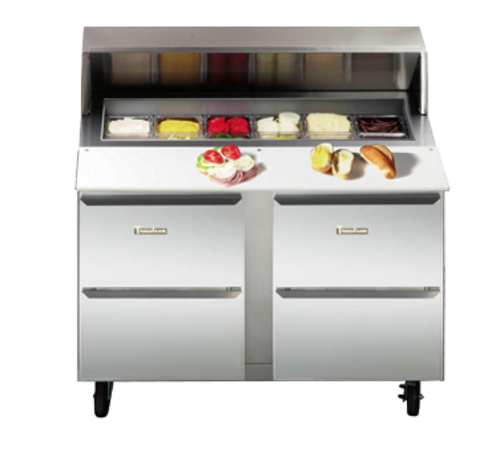 Dealer's Choice Compact Prep Table Refrigerator with roll-top lid which serves as an overshelf, (4) drawers, two-section, 72" wide, top rail holds (18) 1/6 pans 4" deep (included), drawers hold (8) 1/6 pans per drawer (not included), top rail & drawers can accommodate up to 6" deep pans. Full length reversible cutting board, stainless steel exterior top, sides & drawers, anodized aluminum interior, galvanized exterior back & bottom, rear mounted, self-contained refrigeration, R290 Hydrocarbon refrigerant, (6) 4" casters, 1/4 HP, cETLus, NSF