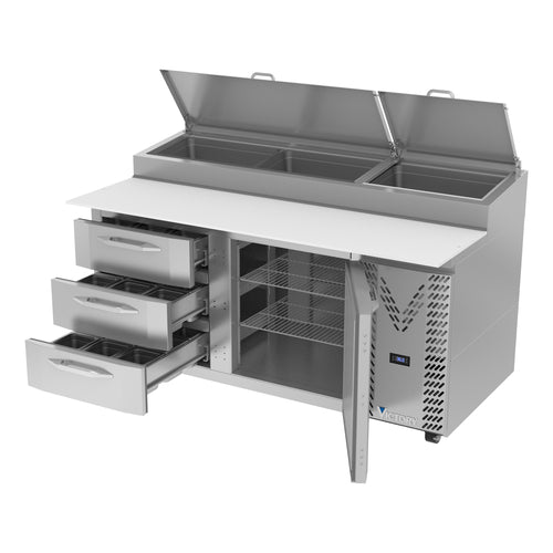 Pizza Prep Table, two-section, 67-1/8"W, self-contained, 20.68 cu. ft. capacity, (1) self-closing doors, (2) epoxy coated shelves, (3) drawers, stainless top, 19" cutting board, hinged, insulated flat lift-up lid, full electronic control, stainless steel door, front & sides, aluminum interior, Santoprene gaskets with 2 year warranty, side mount refrigeration system, 1/2 HP, cULus, UL EPH Classified, UL-Sanitation, MADE IN USA