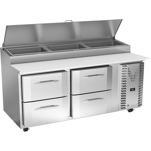 Pizza Prep Table, two-section, 72-1/8"W, self-contained, 22.77 cu. ft. capacity, (4) drawers, stainless top, 19" cutting board, hinged, insulated flat lift-up lid, full electronic control, stainless steel door, front & sides, aluminum interior, Santoprene gaskets with 2 year warranty, side mount refrigeration system, 1/2 HP, cULus, UL EPH Classified, UL-Sanitation, MADE IN USA