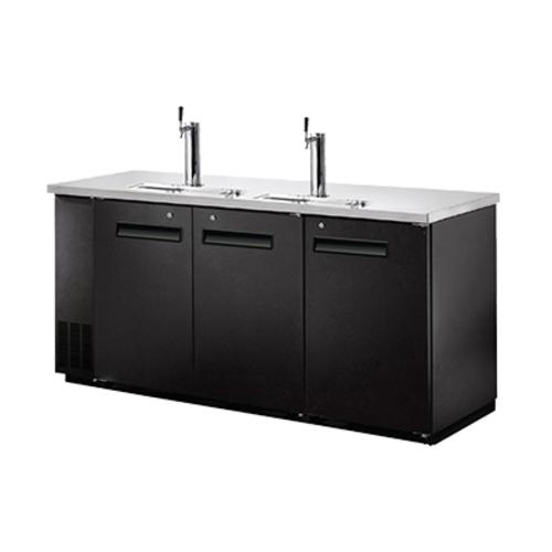 Direct Draw Beer Cooler, three-section, 20 cu. ft., (3) solid doors, (2) beer taps, (3) 1/2 barrel capacity, digital temperature control, interior LED lighting, stainless steel top, black vinyl back, sides & doors, epoxy coated aluminum interior, self-contained refrigeration, side mounted compressor, R290 refrigerant, 1/4+ HP, 115v/60/1-ph, 4.0 amps, NEMA 5-15P, cETLus, ETL-Sanitation