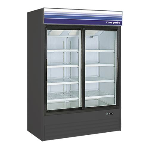 Reach-in Refrigerator, two-section, 45 cu. ft., (2) glass slide doors, mechanical temperature control, (8) adjustable shelves, interior LED lighting, heavy-duty caster wheels, black coated steel exterior, aluminum interior liner with steel floor, self-contained refrigeration, bottom mounted compressor, R290 refrigerant, 1/4+ HP, 115v/60/1-ph, 4.8 amps, NEMA 5-15P, cETLus, ETL-Sanitation