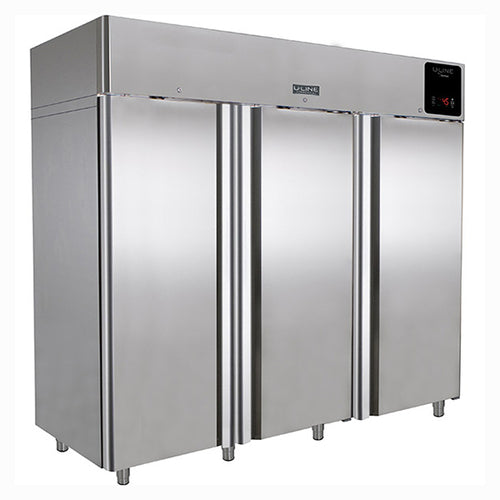 U-Line by Desmon Freezer, Reach-In, self-contained refrigeration, three-section, (3) solid doors, 72 cu. ft., 14° F to -13° F temperature range, auto defrost, epoxy coated & sealed evaporator, includes (9) epoxy coated wire shelves, LED lighting, electronic digital temperature control with alarm, R290 refrigerant, 115v/60/1-ph