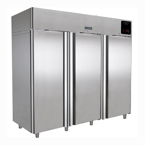 U-Line by Desmon Refrigerator, Reach-In, self-contained refrigeration, three-section, (3) solid doors, 74 cu. ft., 28° F to 46° F temperature range, auto defrost, epoxy coated & sealed evaporator, includes (9) epoxy coated wire shelves, electronic digital temperature control with alarm, R290 refrigerant, 115v/60/1-ph