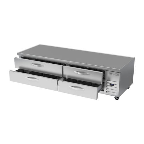 Worktop Cook Stand Freezer, two-section, 84"W, 17.46 cu. ft., (4) drawers, top drawer holds (3) left & (2) right) 12" x 20" x 6" pans per drawer & bottom drawer holds (3) left & (2) right) 12" x 20" x 6" pans per drawer (NOT included), digital display, fire-proof stainless steel top, front & sides (no heat shield required), full marine drip guard, aluminum interior, expans per drawerion valve technology, self-contained refrigeration, R290 Hydrocarbon refrigerant, 3/4 HP, cULus, UL EPH Classified, UL-Sanitation, Made in USA