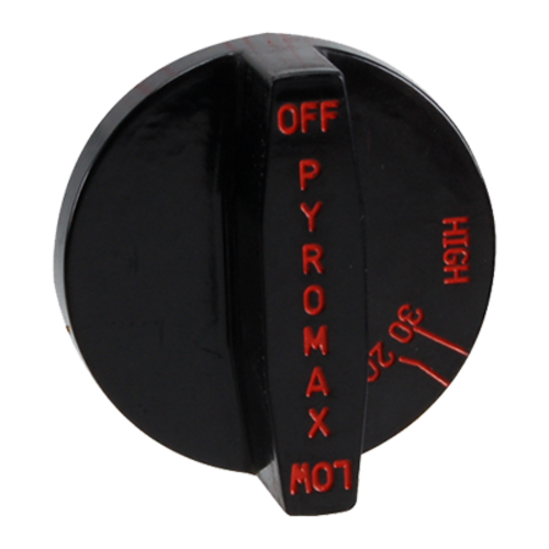 Burner Knob, .35"D-stem, flat up in "off" position, black, red lettering, plastic heat resistant
