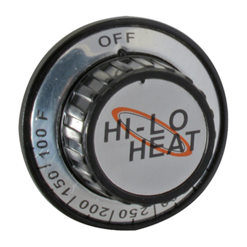Thermostat Knob, 1-7/8" OD x 13/16"D, 100° to 350° F temperature range, .250" x .185"D-stem, black, plastic