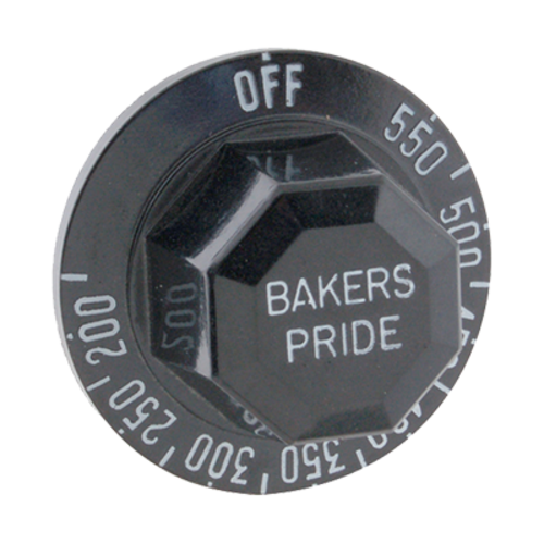 Thermostat Knob, 2" OD, 200° to 550° F temperature range, 3/16" x 1/4"D-stem, flat down, black, plastic