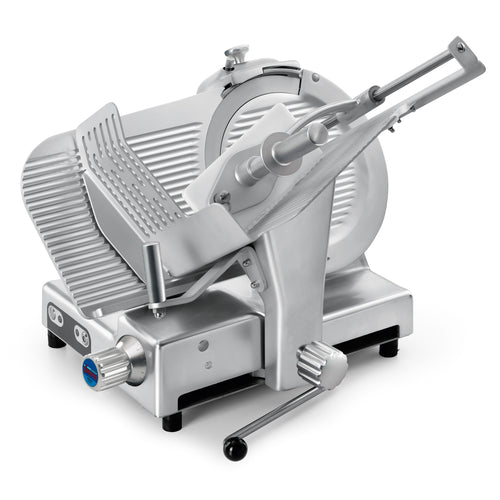 (15334528SNA) Food Slicer, electric, heavy-duty/supermarket, manual, gravity feed, belt driven, 13" dia. chromium-plated alloy blade, up to 1" slice thickness, removable built-in sharpener, removable tilt-carriage with safety hand guard, stainless steel shaft assembly & dual-stage cam, includes permanent blade rim guard & inner blade guard, dustproof & waterproof stainless steel controls, top version with aluminum knobs & handles, overload protection & no-volt release, anodized aluminum construction, 1/2 HP, 410 watts, 120v/60/1-ph, 3.4 amps, UL, ETL-Sanitation