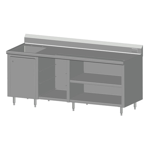 Universal Stainless Beverage Counter, with rack slides; 84" long, 30" wide, 16/300 series stainless steel top; 18/300 series stainless steel body and undershelves; 16"x18"x12" sink bowl integral with top; bowl on left, NSF, CSA