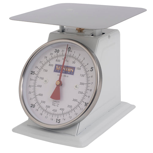 Portion Control Scale, analog, 32 oz. x 1/4 oz. (900g x 5g) capacity, dual measure (ounces & grams), angled, rotating dial, top loading counter model, shatterproof lens, 7-7/8” stainless steel platform, white