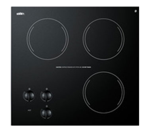 Radiant Cooktop, electric, 20-5/8" W, three-burner, cutout dimensions: 19.88"W x 18.38"D x 3.38"H, smooth EuroKera black ceramic glass surface, European design, push-to-turn knob, residual heat indicator light, 230v/60/1-ph, UL, ULC (Residential)