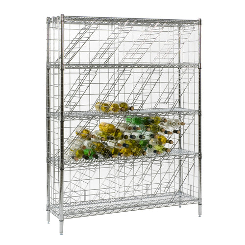 Bulk Wine Bottle Storage, 5-tier, 48"W x 14"D x 63"H, holds (192) 750mL bottles, (5) wire shelves, (16) dividers, enclosed on sides & rear, (4) 63"H posts grooved in 1" increments, chrome finish