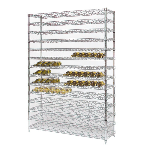 Wine Bottle Display Rack, 14-tier, 24"W x 14"D x 74"H, holds (84) 750mL bottles, (14) wire cradle wine shelves with plastic clips, (4) posts grooved in 1" increments, chrome finish
