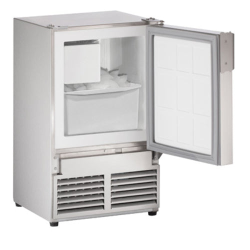 Marine Series Ice Maker With Bin, built-in or freestanding, crescent-style, air-cooled, rear mount self-contained condenser, 14"W, up to 23 lbs/24 hours production capacity, 12 lbs. storage bin capacity, (1) solid field reversible door with latch (no flange), manual defrost, on/off switch, white interior, stainless steel exterior, R134a, 115v/60/1-ph, 18.0 amps, UL