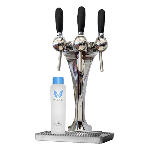 Vero Chrome Cobra Tower 70 Water Dispensing System, (1) countertop dispenser tower (20-3/4"H) with (3) lever handle taps, (1) 15-1/8"W x 5"D drip tray, (1) undercounter chiller & carbonator (12-1/2"W x 18-3/4"D x 21-13/4"H), (1) external filtration package (23-1/2"W x 5-5/16"D x 17-7/16"H), produces chilled still & chilled sparkling water, pressure regulator, cold carbonation, 60 liters/hour chilling capacity, 120v/60/1-ph, 6.0 amps (Leasing options available - contact factory for information)