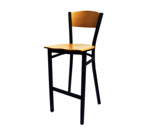 Barstool, wood plain back, upholstered 2" padded seat, fully welded powder coated 16 gauge steel frame with black textured finish, footrest, plastic floor glides, grade 7 uph.