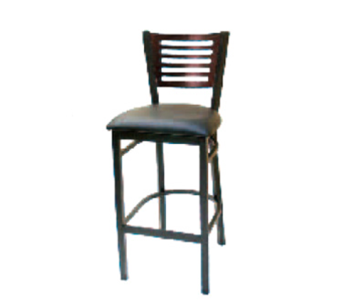 Bar Stool, wood back with strips cutout (finish to be specified), seat to be specified, welded 1-1/8" square metal tubing, footrest, clear coat finish