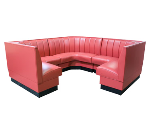 Corner Booth, 3/4 circle, 46" x 88" x 88" x 46"L, 36" high, 12-channel back, sinuous spring seat with connecting links, upholstered, heavy duty hardwood frame, 4-3/4" high vinyl kick base, finished outside back on the returns, grade 5 uph.