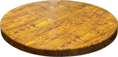 Table Top, round, 24" round, resin, 3/4" core with 2" drop edge, 1" radius corners with eased edges, includes base mounting block, high gloss, vintage walnut finish, Quick Ship