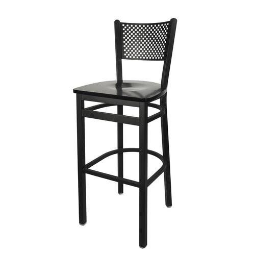 Polk Barstool, perforated back, wood seat, footrest, metal frame with sand black finish