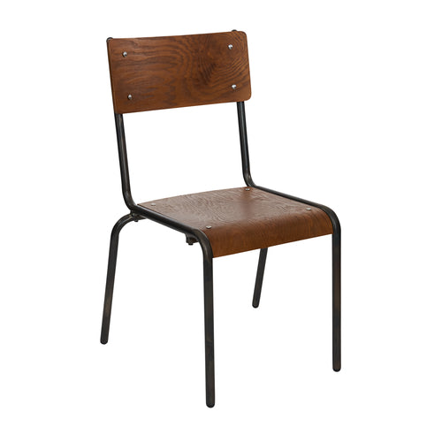 Nash Stacking Side Chair, industrial design, ash wood veneer over bent plywood seat and back, steel tube frame with clear distressed powder coat finish, autumn ash stain finish
