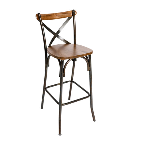 Henry Barstool, cross back, autumn ash wood back, upholstered seat, footrest, steel frame with rustic finish, grade 4 uph.