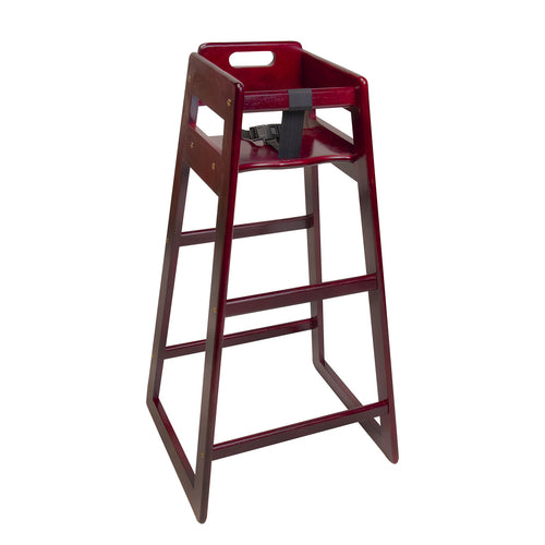 Deluxe High Chair, 20-1/2"W x 19-3/4"D x 39-1/2"H, pub height, stackable with protective pads, "A-frame", 1-1/2"W seat belt & crotch strap, scalloped seating, wood, mahogany, ASTM F404-18 compliant (ships assembled)