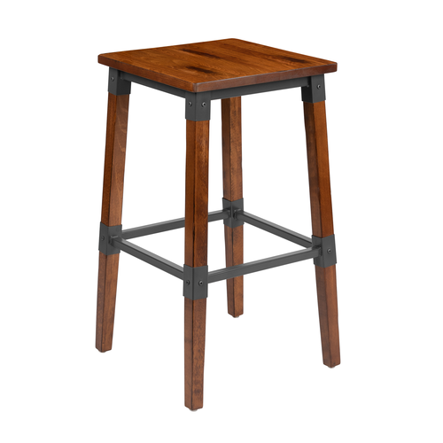 Dining Barstool, 500 lb. weight capacity, mortise and tenon style construction with metal wood screw reinforcements, support bar, footrest, wood seat, rustic walnut finish, beechwood frame, plastic floor glides (set of 2) (in stock items usually ship within 24 hours)