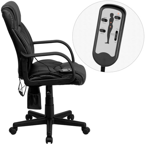 Massaging Executive Swivel Office Chair, 37" to 41-1/2" adjustable height, 250 lb. weight capacity, high back design, with headrest, waterfall seat, contrasting white stitching, LeatherSoft upholstery, side pocket, remote control functions: power on/off control, lumbar and thigh on/off control, variable intensity levels, built-in lumbar support, nylon arms, CA117 fire retardant foam, heavy duty black nylon base, dual wheel casters, black (assembly required) (in stock items usually ship within 24 hours)
