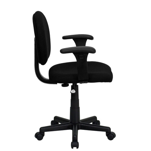 Ergonomic Swivel Task Chair, 33" to 37-1/2" adjustable height, 250 lb. weight capacity, low back design, contoured seat and back, fabric upholstery, back depth adjustment knob, accordion back cover, height adjustable padded arms, CA117 fire retardant foam, heavy duty black nylon base, dual wheel carpet casters, black (assembly required) (in stock items usually ship within 24 hours)